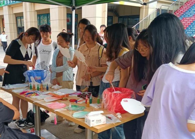 在活动当天,志愿者们用心地选择了“团扇”这一象征着家庭团圆、吉祥如意的小物件,并将其与中华优秀非物质文化遗产——“漆画”相结合的形式开展了此次特色活动。现场参与的同学会得到一把空白的团扇,充分发挥自己的想象力,通过新颖的色彩搭配和不同的渲染手法,结合自己的创意,动手制作一把独一无二的“漆扇”,一幅幅色彩鲜艳,线条流畅的漆画扇面出现在参与者的手上。