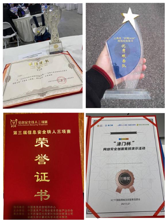 Stalker战队自2016创立以来,多次参加网络安全竞赛并取得优异成绩:2018年在江西省大学生网络安全技能大赛中获得第九名;2019年取得工业信息安全大赛深圳站第二名、江西省大学生网络安全竞赛第二名、江西省大学生信息安全竞赛二等奖、三等奖;2020年斩获“赣网杯”网络安全技能大赛冠军与江西省大学生网络安全技能大赛第一名、羊城杯网络安全大赛二等奖、易霖博CTF线上第七名、江西省大学生网络安全技能大赛第一名、工业信息安全大赛石家庄站第五名、全国大学生信息安全竞赛华东南赛区特等奖、全国大学生信息安全竞赛决赛三等奖、江西省工业互联网安全技能大赛二等奖、全国工业互联网安全技能大赛二等奖等荣誉。